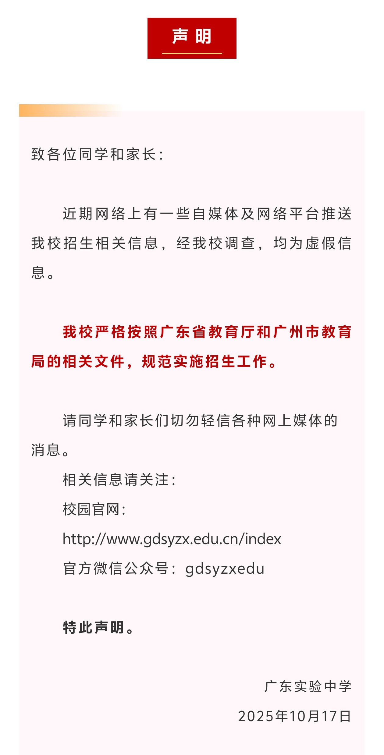 近日欧洲杯体育,网罗平台及部分自媒体推送的广东推行中学招生的关联骨子激发烧心。对此,广东推行中学于10月17日发布声明,示意关联骨子均为瑕疵信息。