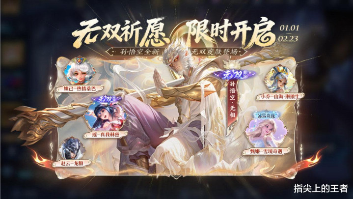 孙悟空无双皮肤上线,联动着两款无双皮肤返场,一款神话返场,和两款史诗返场。