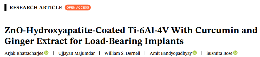 最近,华盛顿州立大学的 Susmita Bose 训导团队在《好意思国陶瓷学会杂志》(Journal of the American Ceramic Society)上发表了一项前沿商讨,提议了一种转换性的照看决策:在钛合金名义喷涂一层含有锌(Zn)、姜黄素和生姜提真金不怕火物的复合生物涂层。