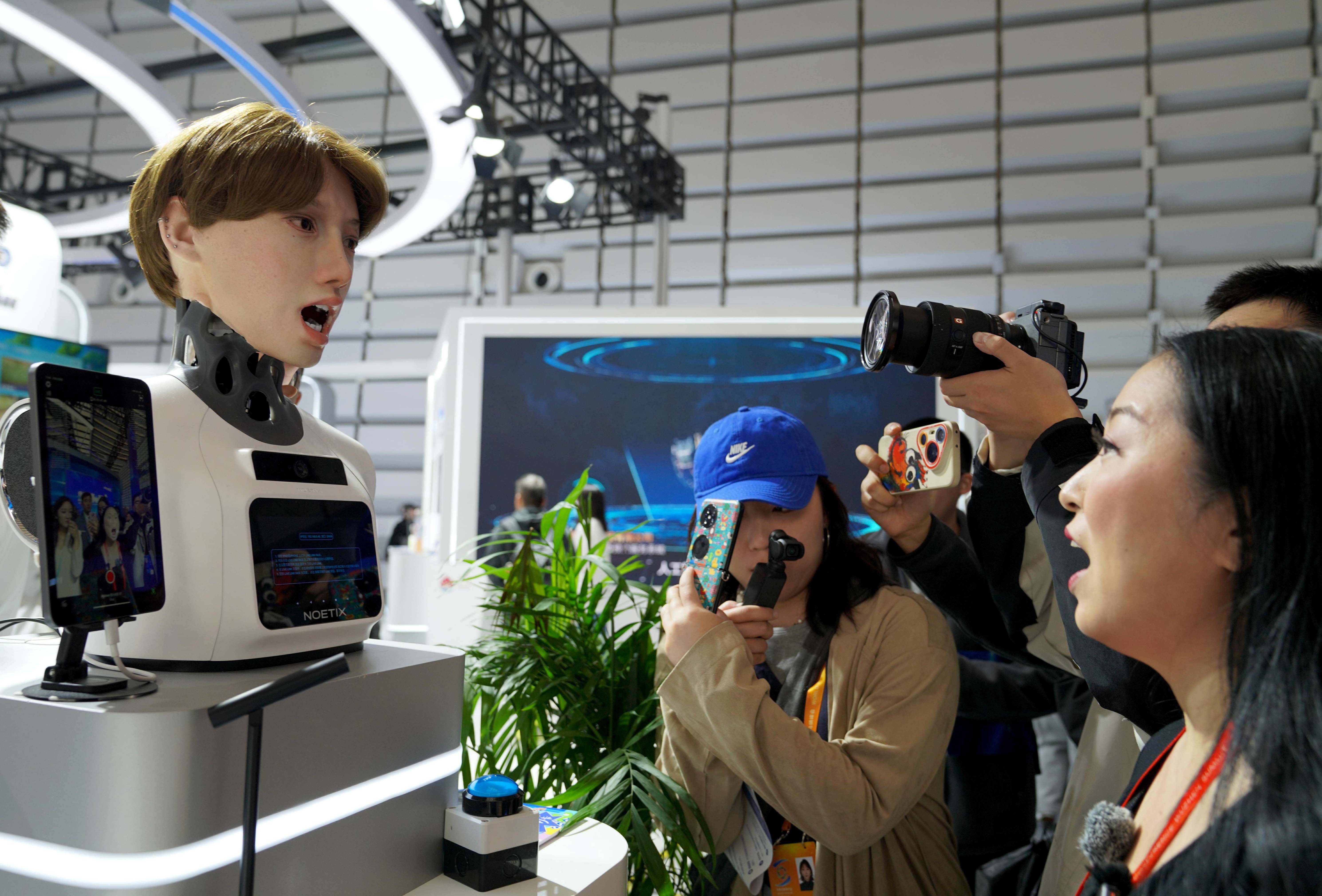 2025年11月6日,又名责任主说念主员与一款松延能源仿期许器东说念主互动。新华社记者 赵宇想 摄